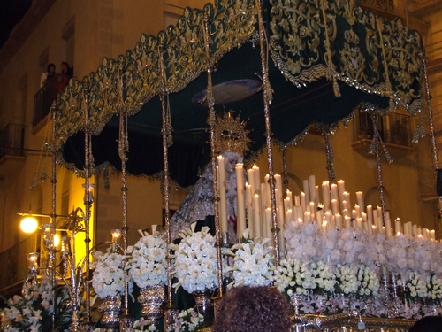 Juego de jarras, crestería en el palio, varales de palio, peana, candelería y candelabros de cola, plateados y repujados por los Hnos. Angulo de Lucena. Crono en metal dorado.