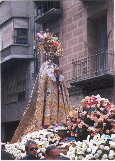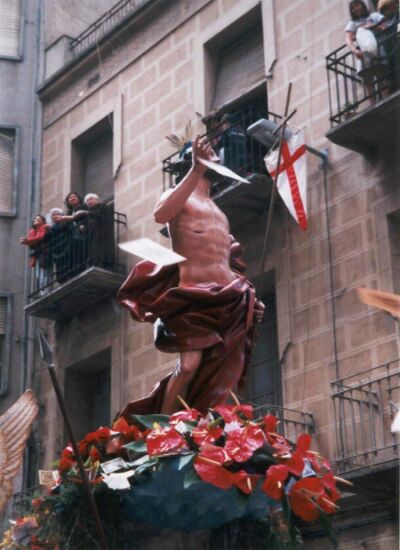 El domingo de Resurrección la alegría se traslada a las calles de Elche. En la mañana transcurre po rel centro de la ciudad una alegre y luminosa procesión, en la que participan las imágenes de Cristo Resucitado, talla del s.XVIII donada a la iglesia de Sta María por el Obispo José Tormo de Juliá, y la de la Virgen de la Asunción (Patrona de Elche). Esta última es portada en procesión en esta jornada al menos desde 1531. al paso de los tronos de estas dos imágenes, que celebran un emotivo encuentro en las confluencias de dos céntricas calles, son lanzados cientos de miles de aleluyas.